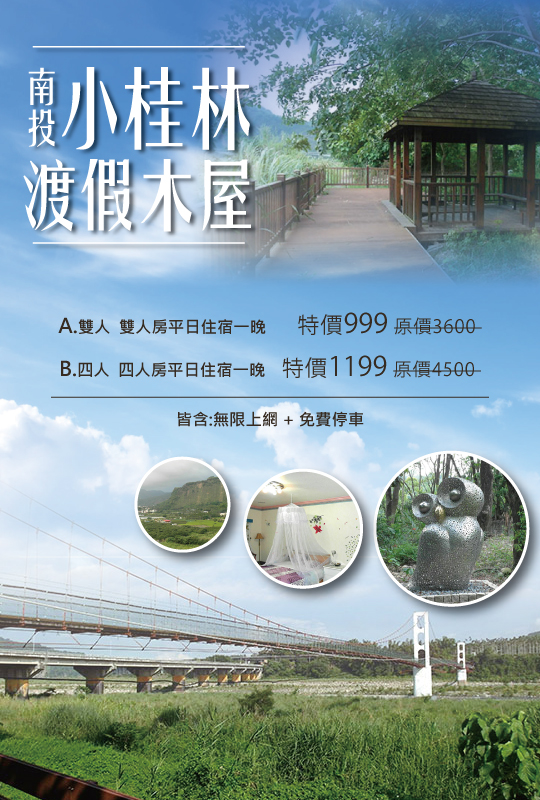 只要999元起,即可享【南投-小桂林渡假木屋】夏日輕旅行~小資首推A.雙人/B.四人〈A.雙人房/B.四人房 平日住宿一晚 + 無線上網 + 免費停車〉