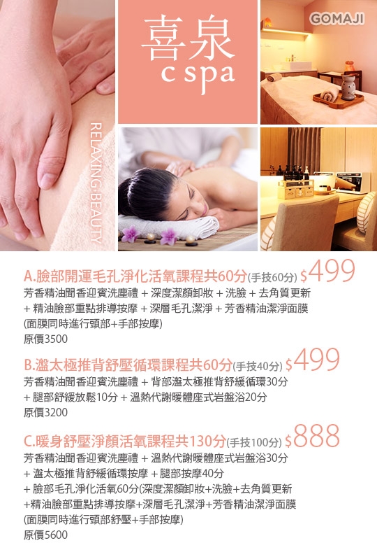 喜泉c spa(西屯店) - 147885是最近關注的一項還算不錯的商品,一樣是在Gomaji上發現的。我真的非常喜歡逛Gomaji,尤其很多東西價格都很不錯,也有不少優惠券可以用,下面是賣場提供的商品簡介:
