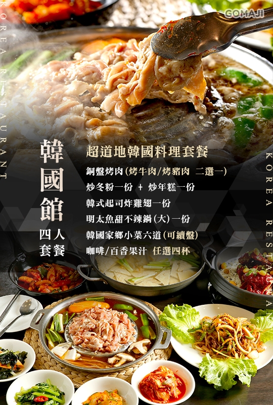 銅盤烤肉(烤牛肉/烤豬肉 二選一) + 炒冬粉一份 + 炒年糕一份 + 韓式起司炸雞翅一份 + 明太魚甜不辣鍋(大)一份 + 韓國家鄉小菜六道(可續盤) + 咖啡/百香果汁 任選四杯
