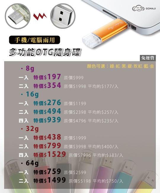 手機/電腦兩用多功能OTG隨身碟 1入起 - 145363是最近關注的一項還算不錯的商品,一樣是在Gomaji上發現的。我真的非常喜歡逛Gomaji,尤其很多東西價格都很不錯,也有不少優惠券可以用,下面是賣場提供的商品簡介: