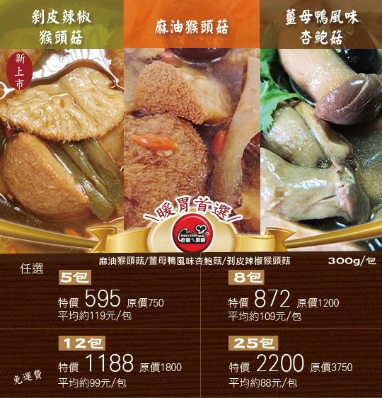 成份:杏鮑菇、薑汁、香菇、黑麻油、醬油、調味劑